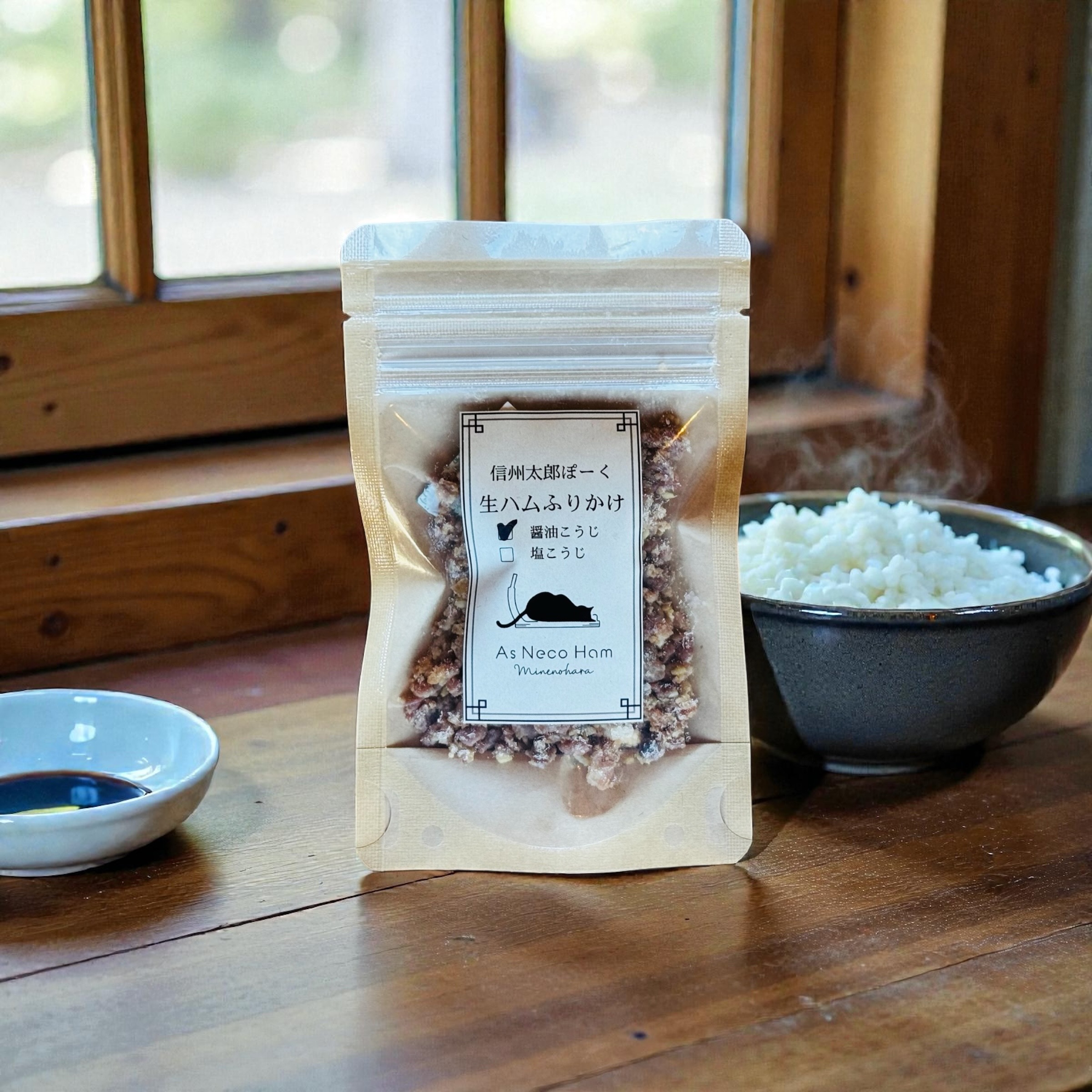ふりかけ 生ハムふりかけ(醤油こうじ) ¥540 信州太郎ぽーく生ハムの旨みを凝縮し、醤油こうじで仕上げた、ごはんが進む贅沢ふりかけ。 在庫10個 数量 生ハムふりかけ(醤油こうじ)個 お買い物カゴに追加 お気に入りに追加お気に入りに追加済み 備考 重さ 30 g サイズ 15 × 9 × 1 cm レビュー レビュー投稿には、会員登録が必要です。会員登録する コメントをキャンセル 上に表示された文字を入力してください。 信州太郎ぽーくの生ハム端材を活用して、丁寧に乾燥・粉砕し、醤油こうじと合わせて仕上げた生ハムふりかけです。 熟成肉ならではのコクと旨みに、こうじ由来のまろやかな甘みが加わり、シンプルながら奥行きのある味わいに。 温かいごはんはもちろん、卵かけごはんや冷奴、パスタやサラダの仕上げにもおすすめです。日常の食卓に、ひとふりで深みを添える新しい調味料としてお楽しみください。 関連商品 ふりかけ 生ハムふりかけ(塩こうじ) ¥540 在庫切れ